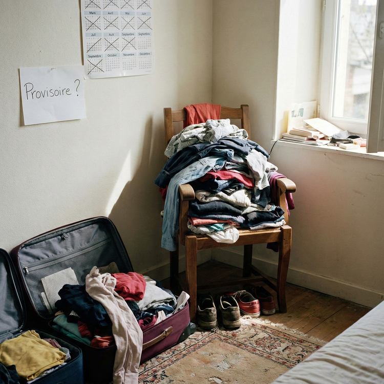 Vêtements empilés sur une chaise, valises ouvertes, linge “provisoire” qui devient permanent… Et au final : une pièce qui paraît plus petite, plus chargée, plus stressante.
