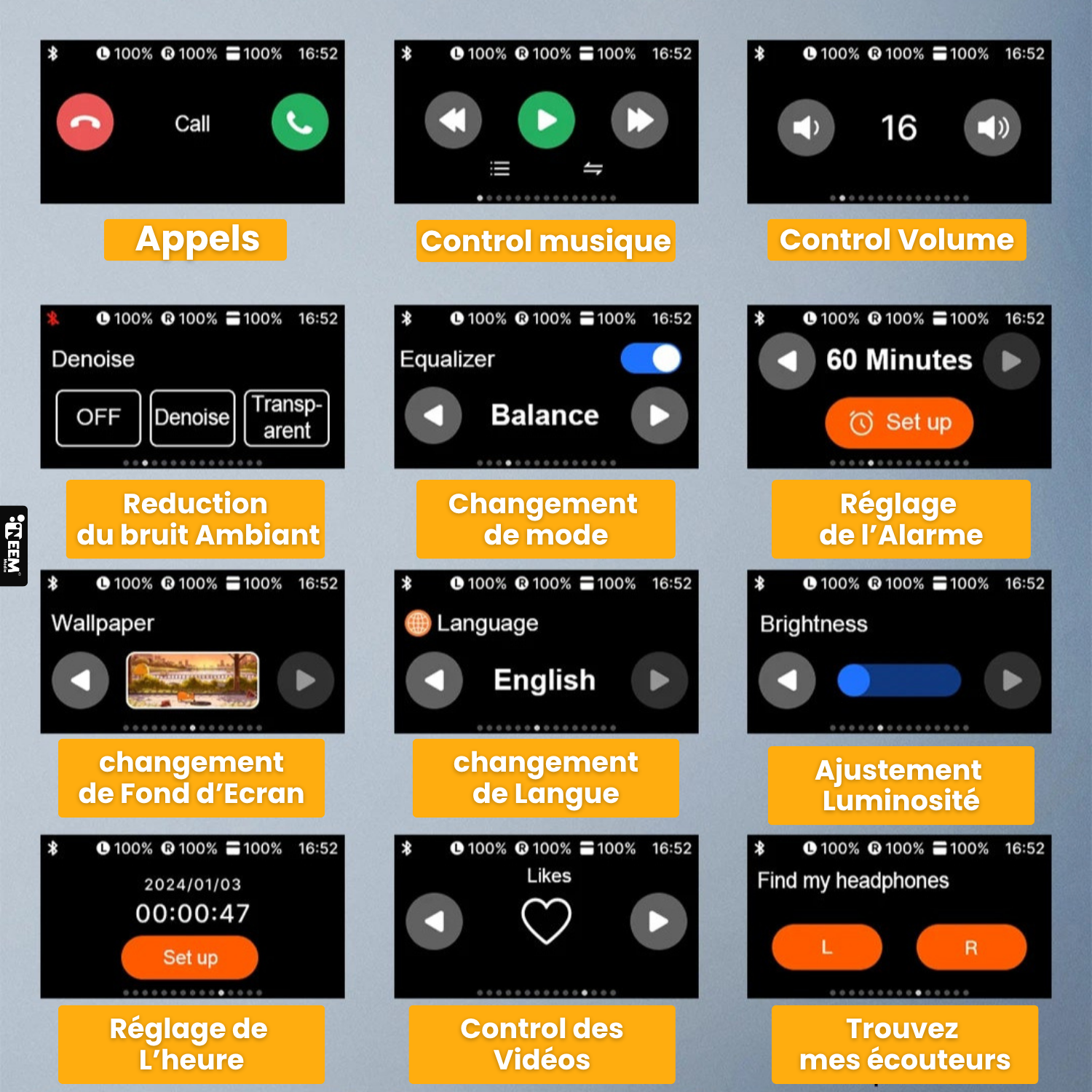 14 fonctions : volume, égaliseur, localisation écouteurs, réveil, assistant vocal, minuterie, caméra, fond d’écran, etc.